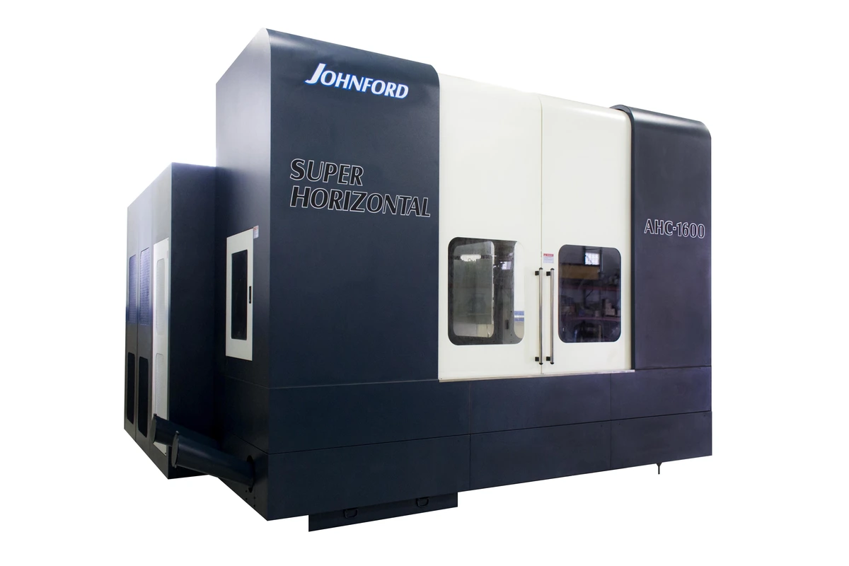 The Johnford AHC-1600 moving column table-type horizontal machining center is ideal for aerospace applications as well a wide variety of other industries. The machine features a moving column for the Z axis and a moving table for the X axis. The design provides maximum rigidity and accuracy as well as full support of the table over the complete X axis travel. The X axis is fully supported by the base with absolutely no overhang, eliminating any need for outriggers or outboard supports to handle high table loads. With standard accessories, the rigid Meehanite cast iron machining center weighs in at more than 40,000 lbs.