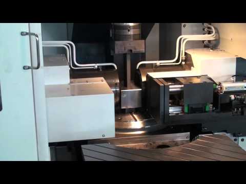 The machines combine a rigid rotary table with dual milling heads. Each milling head moves independently in the Z-axis on rigid box ways. The rotary table moves in the X-axis on roller type linear ways, indexes every 45°, and clamps via a Hirth coupling to maximize rigidity.