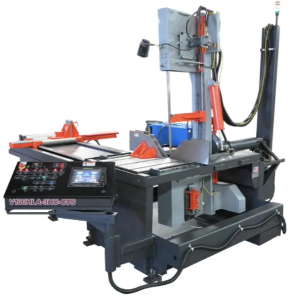 V100HLA-3HC-CTS is a “high column” version of the VT100HLA. It has an expanded height capacity of 31” at 90ᵒ which allows an 18” capacity for 45ᵒ cuts. It is equipped with a 48” bar-feed that is capable of multiple indexes controlled by touch-screen control. Two vises are included.