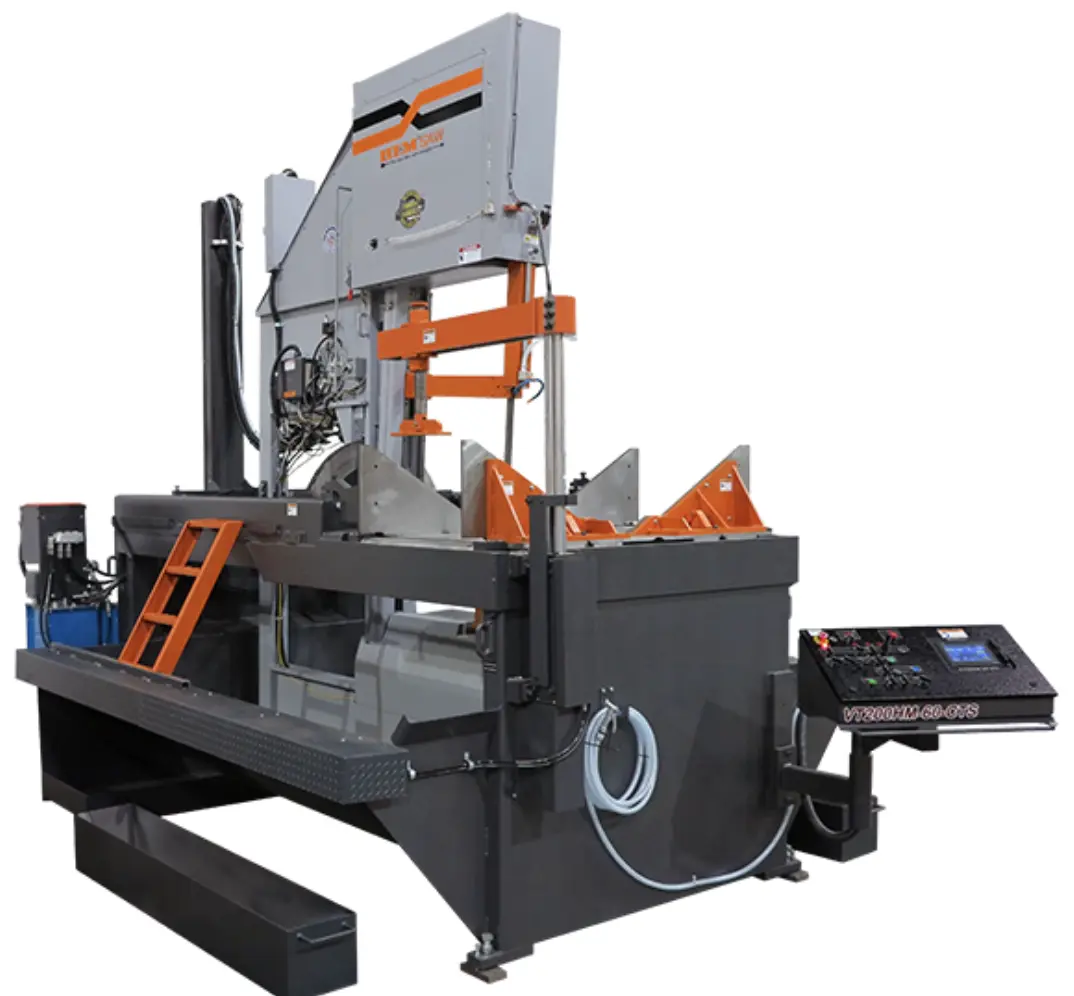 The VT200HM-CTS band saw is operated by a touch screen control that is located in a swing-away console at the front of the saw and allows the operator to enter an angle and the arm will travel to that position and stop. The arm has a forward can't.