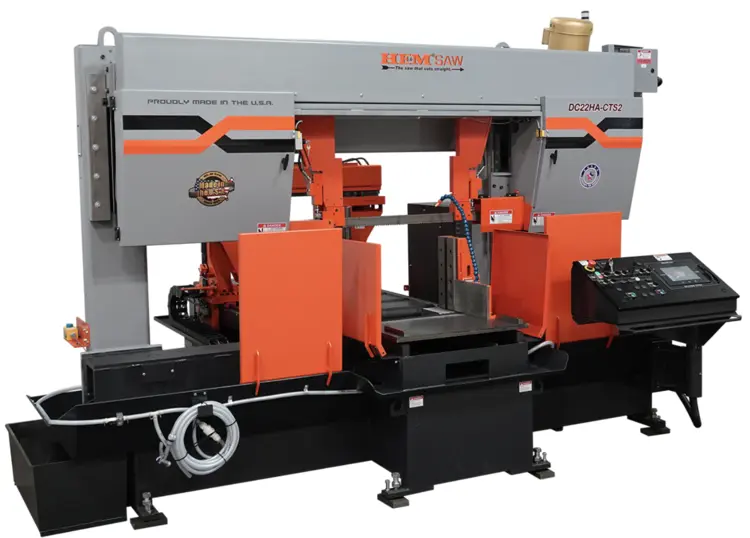 The DC22A band saw operates using a touch screen control mounted in a swing-away console. A 48” servo twin ball-screw bar-feed is standard and a 120” version is optional. A full-stroking main vise positions automatically with the powered guide arm. The Cut Watcher® System and chip auger are standard.