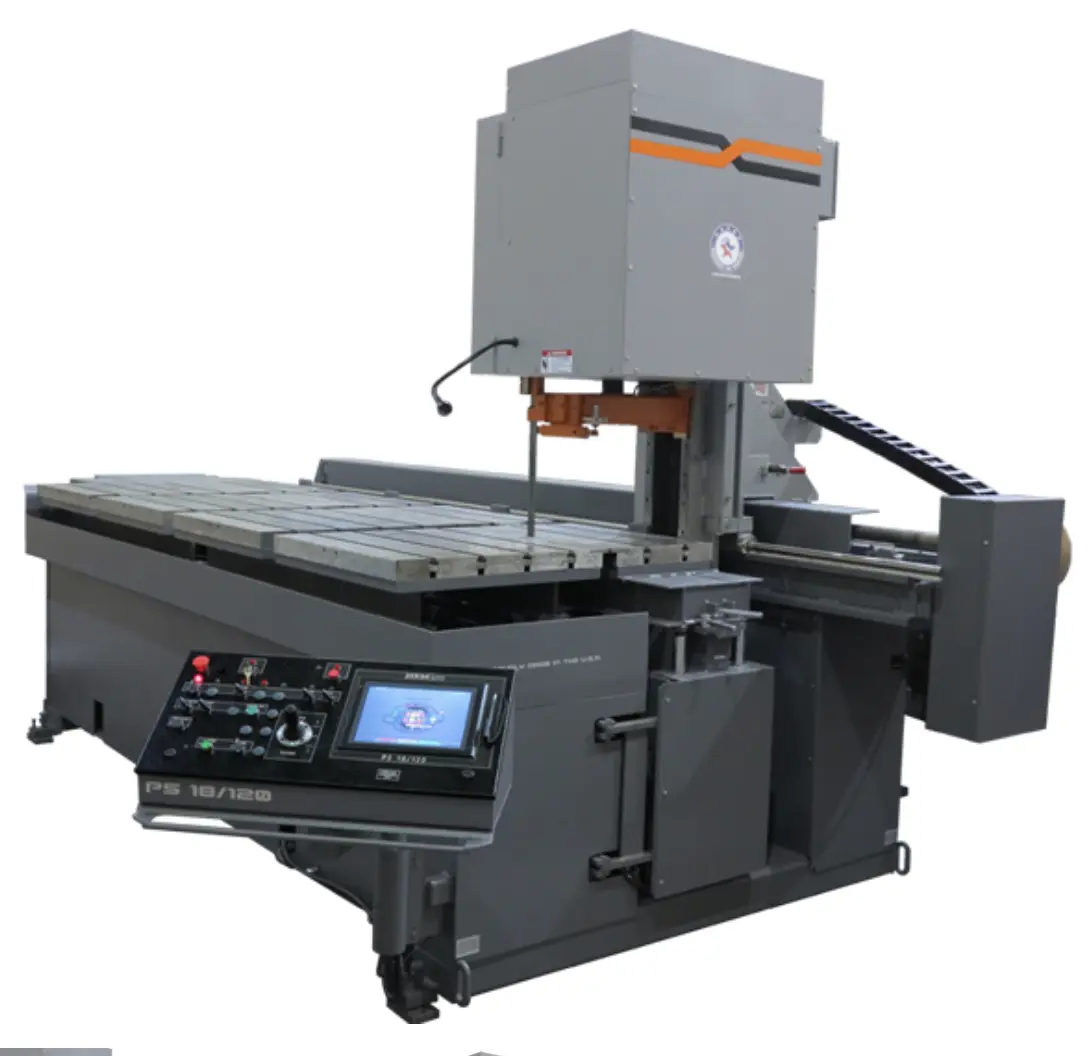 The PS18-120 is a traveling-arm plate saw; the arm travels through the material and is computer-controlled using a touch screen interface. It includes a chip conveyor, the patented Cut Watcher® system, Laser Light and more as standard features. Options include a Servo Controlled Traverse (SCT) and Active Cut Watcher®.