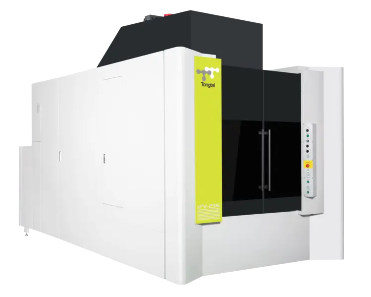 The Tongtai FV Series of single- and twin-spindle vertical machining centers is designed for mass production of complicated workpieces in the automotive, appliance, electronics, and energy industries. Fixed twin-spindle versions can process two individual machining tasks simultaneously, and the addition of a 5-axis trunnion table effectively creates a horizontal machining center. Machines spindles are 12,000 rpm with 40-taper toolholding systems.