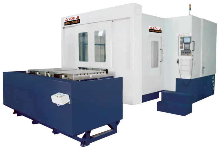 The You Ji HMC series of horizontal boring and machining centers is comprised of sixteen machines covering a wide selection of sizes and capabilities. Travels of X-Y-Z axes start at 51″ x 40″ x 47″ (1,295 mm x 1,016 mm x 1,194 mm) and on the largest machine are 134″ x 71″ x 79″ (3,404 mm x 1,803 mm x 2,006mm). Pallet sizes begin at 20″ x 20″ (508 mm x 508 mm) and the largest are 102″ x 87″ (2,590 mm x 2,209 mm). W-axis travels run from 23.6″ (600 mm) to 27.5″ (698 mm) on machines that offer that feature.