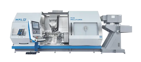 The multifunctional turning-boring-milling centers M30/M35 and M30-G/M35-G allow complete machining of complex shafts and chuck parts with a swing of up to 520mm and machining lengths of up to 2000mm. It can thus function as a lathe, a 5-axes machining centre and if needed as a gear-cutting or deep-hole drilling machine.