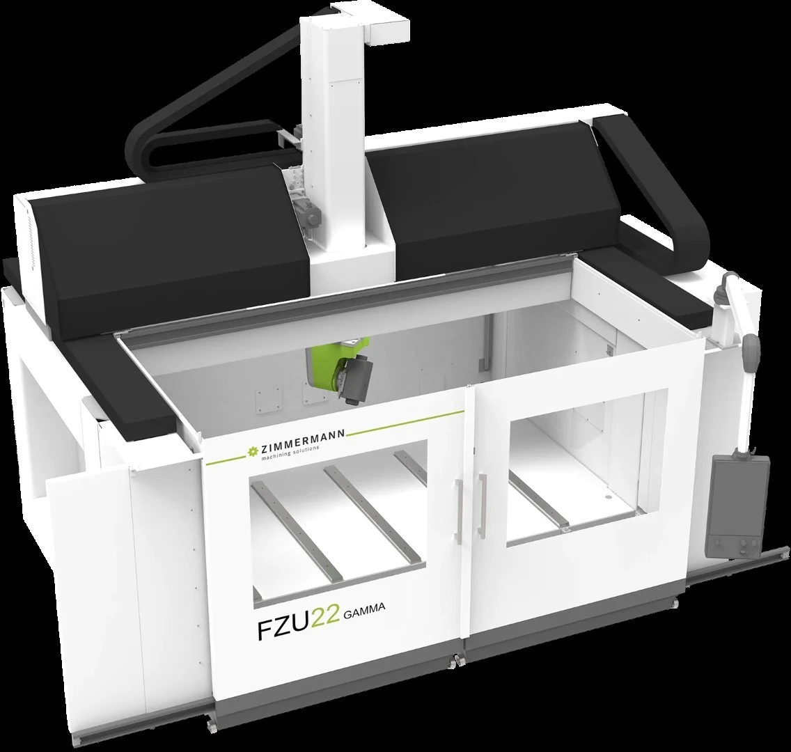 For the machining of many workpiece shapes and materials, our FZU22 in monoblock structure is ideally suited. Aluminum, plastics and wood are their métier, as is the finishing of CFRP parts (carbon fiber and composites). The top-moving gantry also ensures high precision in the production of models and molded parts. The standard version includes the tool changer for 12 tools and a control of the latest generation (Siemens or Heidenhain). The specially developed 5-axis milling head with 15 kW spindle is also suitable for machining hard-to-reach workpiece locations due to its geometry.