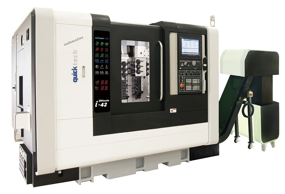 The QuickTECH i-42 / i-60 Ultimate bar processing machines provide complete part machining including complex milling functions. The compact, high precision, high production CNC mill/turn centers are cast from rigid Meehanite iron. Available in both 42 mm (1.65″) and 60 mm (2.36″) bar capacities, the i-42/i-60 features 10 axes, 2 turning spindles, 2 milling spindles, 2 B-axes, and a total capacity of 56 tools. A 4 axis (X,Y,Z,B) gang type vertical tool post serves each C-axis spindle.