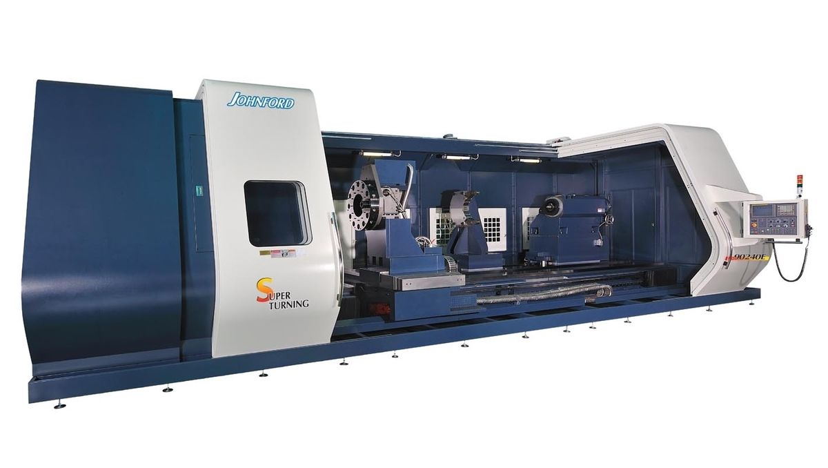 Johnford LC series machines are large, heavy-duty, high-precision flat-bed CNC turning centers. Distance between centers range from 80″ (2,032 mm) to 788″ (20,015 mm) in 39.4″ (1000 mm) increments. Swing over the machine bed ranges from 40″ (1,016 mm) to 90″ (2,286 mm). Spindles are available in 50-133 hp, with a four-speed gearbox spindle drive. C-axis and Y-axis capabilities are optional. Standard are 12 vertical turret tools, with 4 or 6 horizontal, 8 vertical, or twin turrets optional.