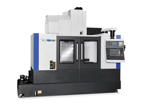 The HYUNDAI WIA F510B Heavy-Duty Vertical Machining Center (43” x-axis, 20” y-axis, 25” z-axis) features box guideways and a 2-step geared spindle head for taking deep cuts with ease.